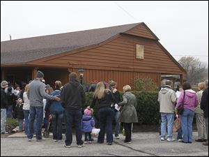 People wait in line outside the shelter during the annual egg hunt at Olander Park in Sylvania. First they enter the shelter so the kids to color their bunny hats, then they do the hunt.