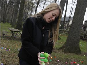 Olander Park employee Casey Fuleky drops eggs for the annual egg hunt at Olander Park in Sylvania.