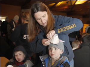 Leesa Draper fits 5-year-old Keegan Draper's hat on his head prior to the start of the annual egg hunt at Olander Park in Sylvani.