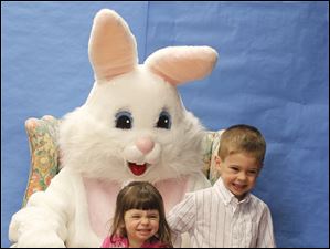 Gabriella Fugazzi, 3, and her brother Andrew Fugazzi, 5, give big grins as they pose with the Easter Bunny for their parent's camera during the annual egg hunt at Olander Park in Sylvania.