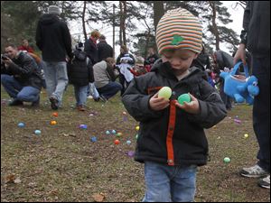 Henry Stipe, 2, inspects an egg during the annual egg hunt at Olander Park in Sylvania.