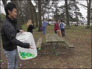 UT student egg hunt volunteer Qianchong Shen distributes eggs for the annual egg hunt at Olander Park in Sylvania.