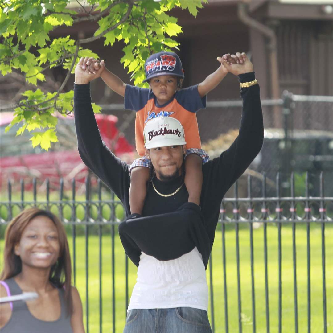 Jaymond Palacio holds his one and a half-year-old son Caleb Palacio as they both move to the sounds of the Scott High School marching band passing by.