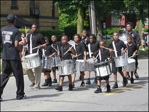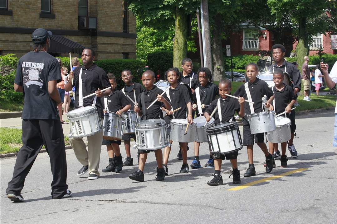 Antha Ann, left, Alex Pritchard, and Taylor Kozak, all of Detroit swing and squat as they and other members of the Detroit Party Marching Band bring sound and style to the Glass City.