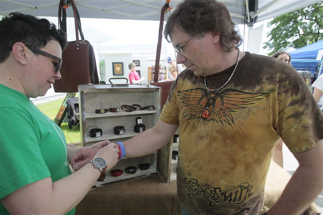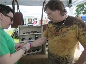 Liz Stutzman, of Dayton, and owner/designer of Vintageliz, handmade leather accessories & handbags, left, sizes a bracelet for Rick Besgrove, of Oregon.