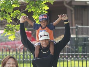 Sam Weimer, 4, of Sylvania, responds to the Detroit Marching Party Band as he is pushed past the performers by his grandmother, Peg Fiegelise, of Tiffin.