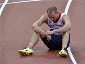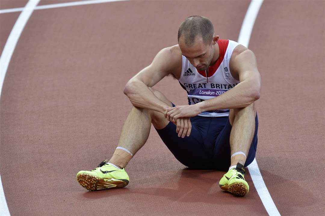 Britain's David Greene reacts after competing in a men's 400-meter hurdles semifinal during the athletics in the Olympic Stadium at the 2012 Summer Olympics, London, Saturday, Aug. 4, 2012. (AP Photo/Martin Meissner)