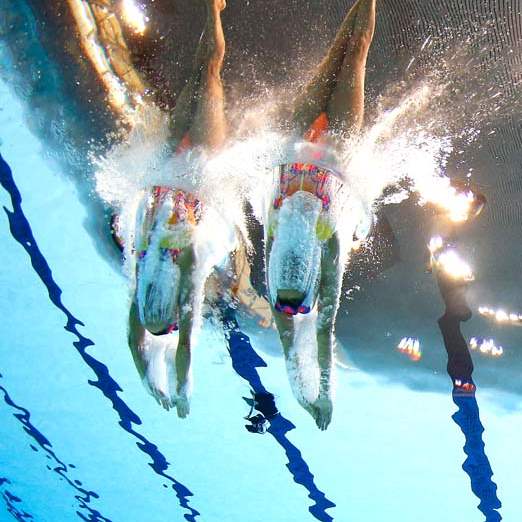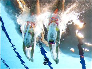Gagnon Boudreau and Elise Marcotte compete during the women's duet synchronized swimming technical routine at the Aquatics Centre.