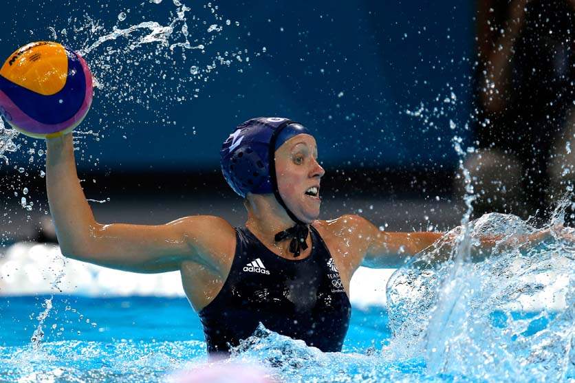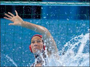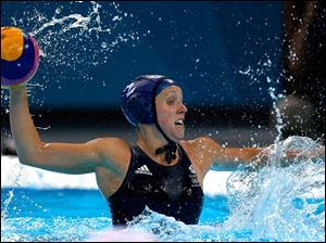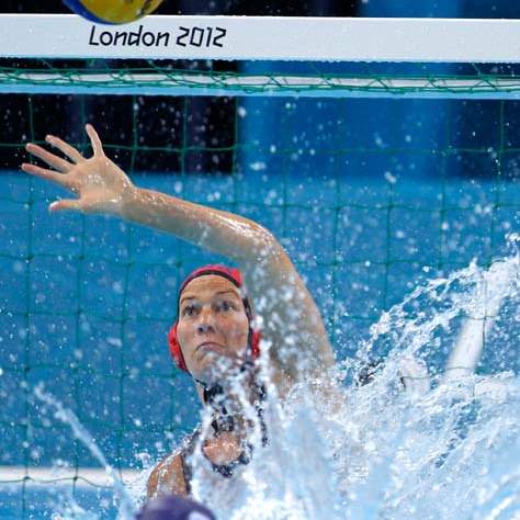 Goalkeeper Robyn Nicholls of Britain makes a save on a shot by Spain during their women's water polo quarterfinal.