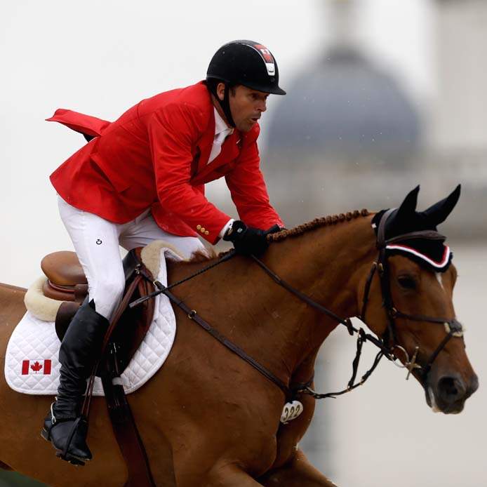 Eric Lamaze, of Canada, rides Derly Chin De Muze, during the equestrian show jumping team competition.