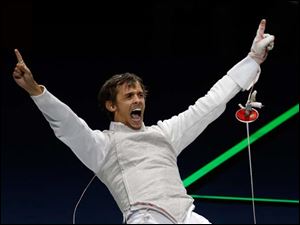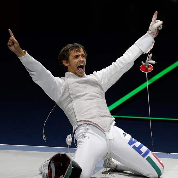 Andrea Baldini of Italy celebrates after his match against Yuki Ota of Japan in the gold medal match during the men's foil team fencing.