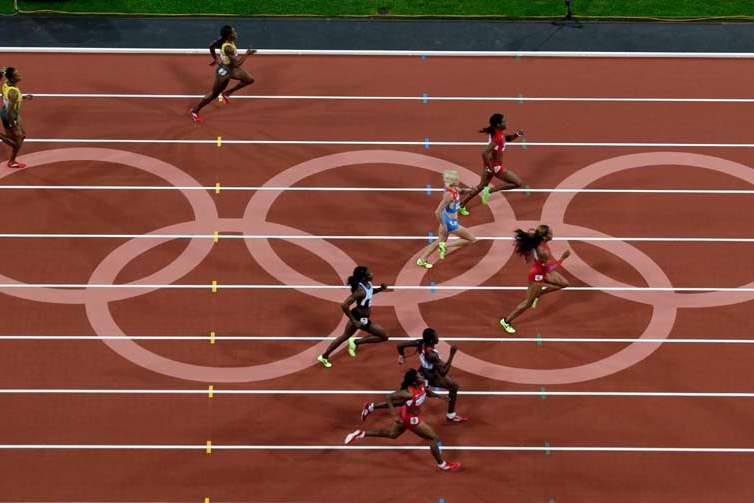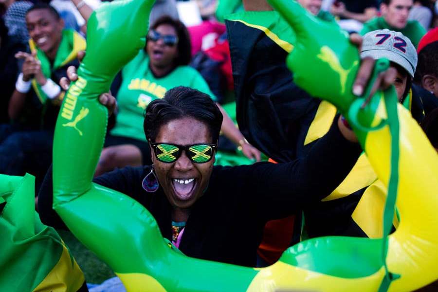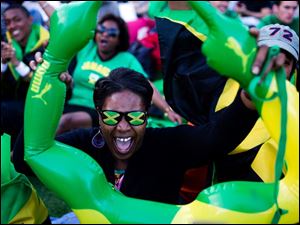 A Jamaica supporter reacts as she watches a broadcast of the men's 100-meter semifinals on a screen at the Puma Yard in London during the 2012 Summer Olympics.