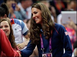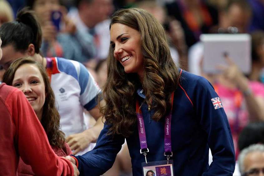 Kate, Duchess of Cambridge, speaks to a spectator during the artistic gymnastics apparatus finals.