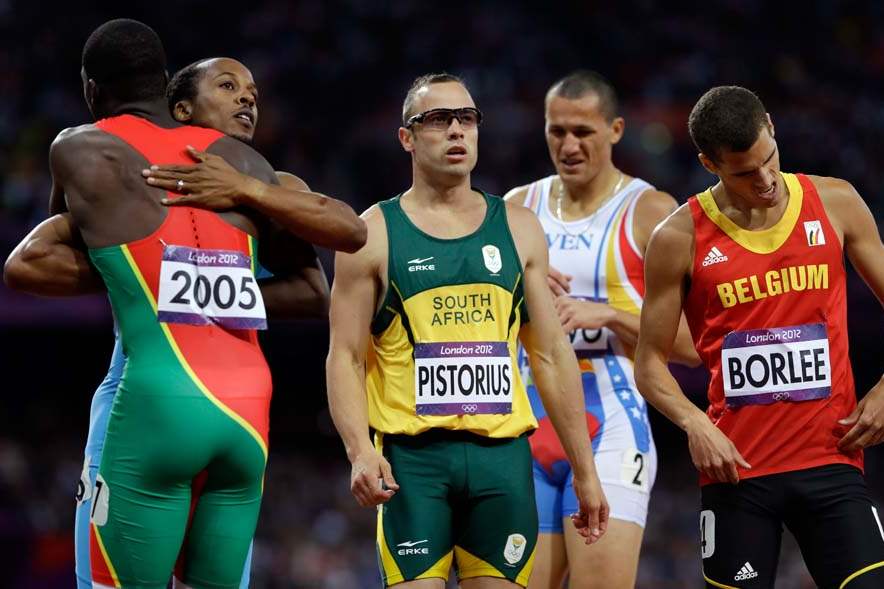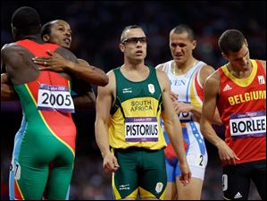 South Africa's Oscar Pistorius reacts after his run in the men's 400-meter semifinal.