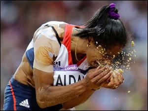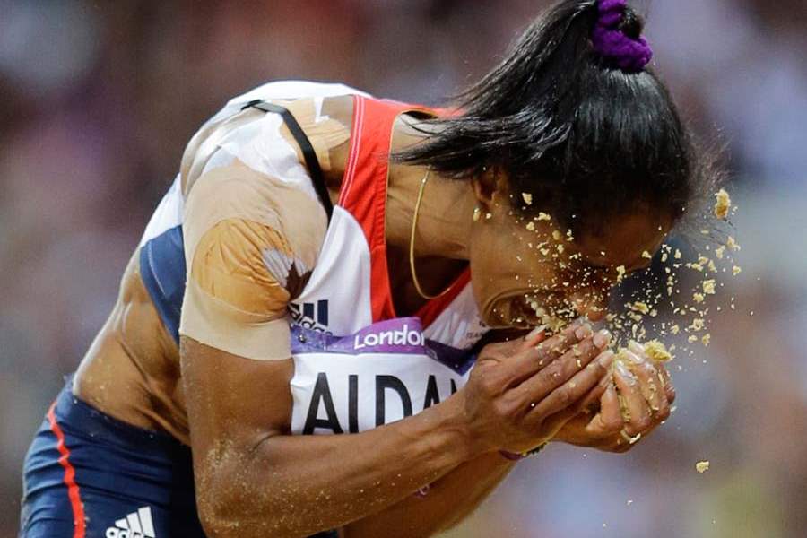 Britain's Yamile Aldama reacts during the women's triple jump final.
