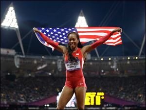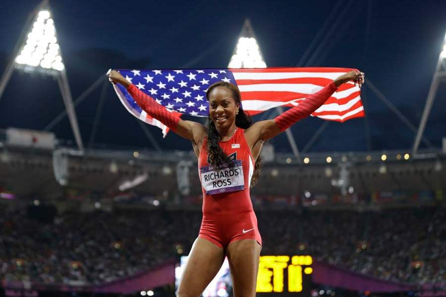 Sanya Richards Ross from the U.S. holds her national flag and celebrates after winning the women's 400-meter final.