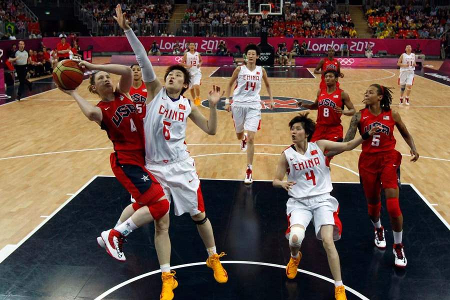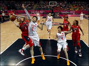 The United State'sLindsay Whalen (4) is guarded by China's Xiaoyun Song (5) during their women's preliminary round basketball game.