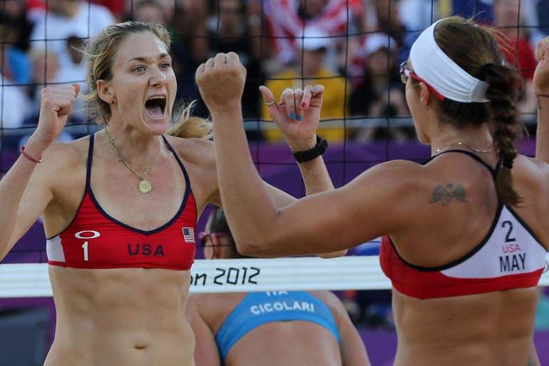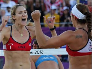 US Kerri Walsh, left, and Misty May-Treanor, right, react during their quarterfinal women's beach volleyball match against Italy.