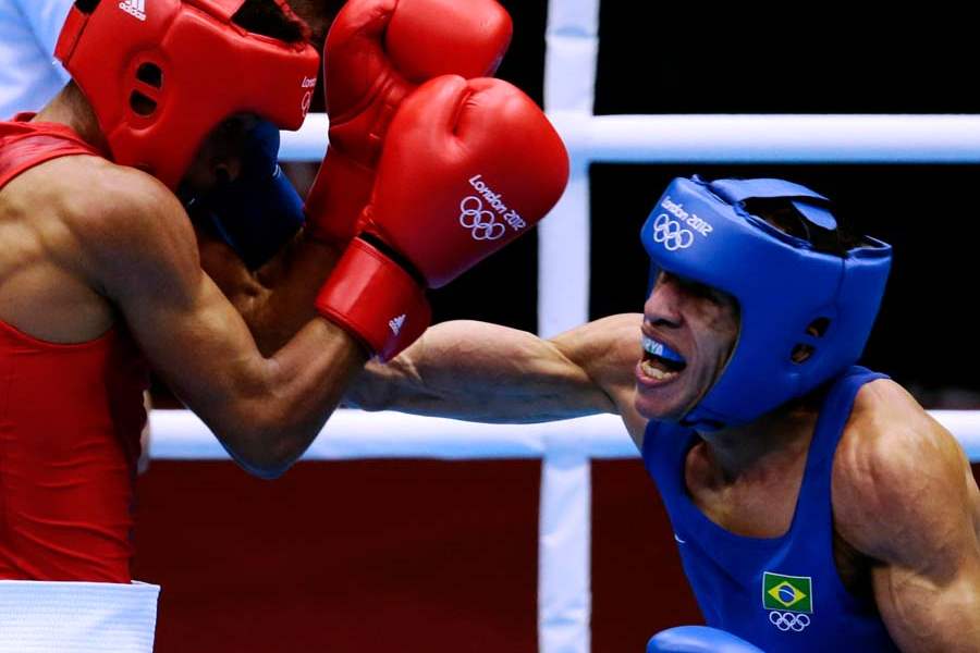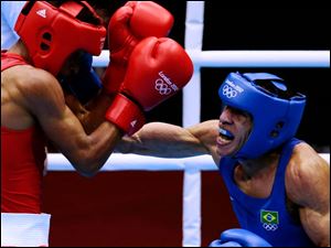 Lazaro Alvarez Estrada of Cuba, left, and Robenilson Vieira de Jesus of Brazil, fight during a bantamweight 56-kg quarterfinal boxing match.v)