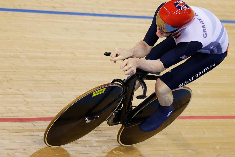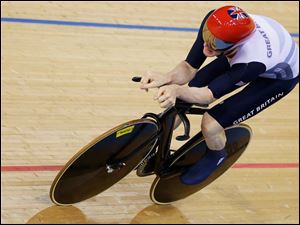 Britain's Edward Clancy races on his way to clinch the bronze medal in the track cycling men's omnium.