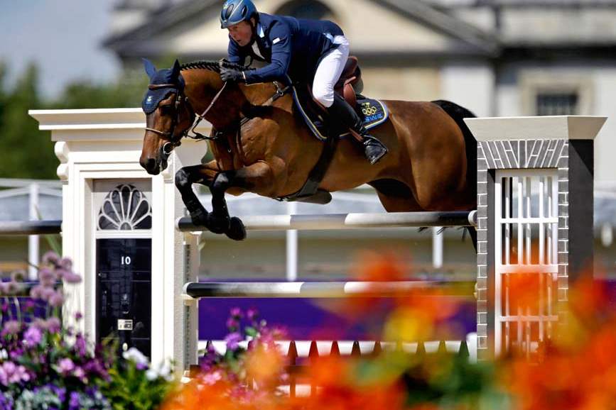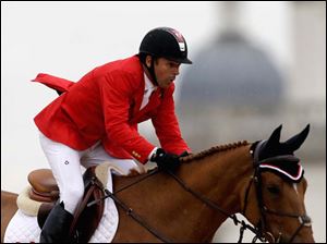 Jens Fredricson, of Sweden, rides his horse Lunatic, during the equestrian show jumping team competition.