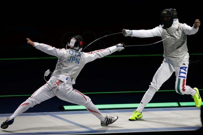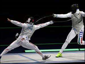 Yuki Ota of Japan competes against Giorgio Avola of Italy, right, during the men's foil team fencing.