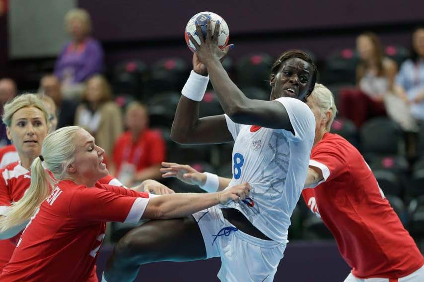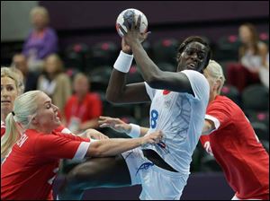Denmark's Trine Troelsen, left, tries to stop France's Claudine Mendy during their women's handball preliminary match.