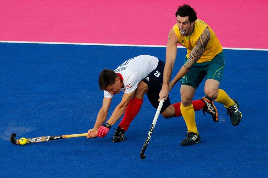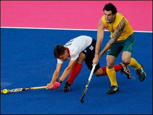 Britain's Lain Mackay, left, and Australia's vie Lain Mackay vie for the ball in a men's hockey preliminary match.