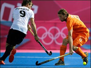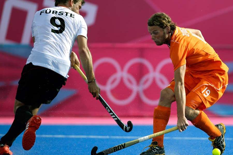 The Netherlands' Bob de Voogd, right, and Germany's Moritz Fuerste battle for the ball in a men's hockey preliminary match between Germany and The Netherlands at the 2012 Summer Olympics.