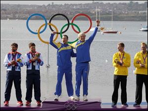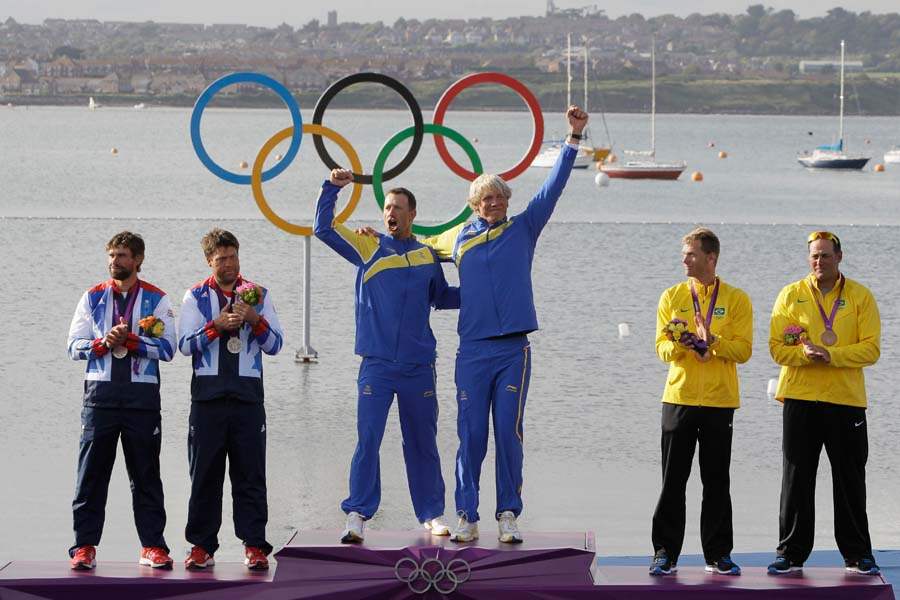 Sweeden's star class team Fredrik Loof and Max Salminen, center, celebrate after winning the gold meda in Weymouth and Portland, England. Great Britain's crew Iain Percy and Andrew Simpson won the silver, left, and Brazil's crew Robert Scheidt and Bruno Prada won the bronze.