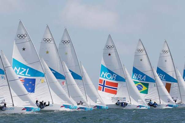 Star class fleet compete during the medal race in Weymouth and Portland, England. Sweden's crew Fredrik Loof and Max Salminen won the gold medal, Great Britain's Iain Percy and Andrew Simpson won the silver and Brazil's crew Robert Scheidt and Bruno Prada won the bronze.