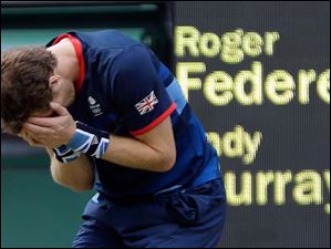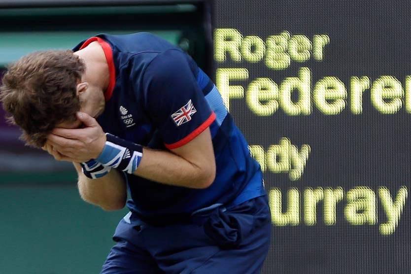 Andy Murray of Great Britain reacts after defeating Roger Federer of Switzerland in the gold medal men's singles match at the All England Lawn Tennis Club in Wimbledon.