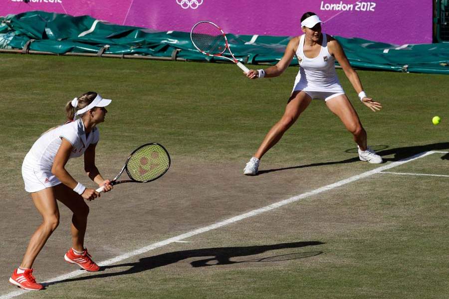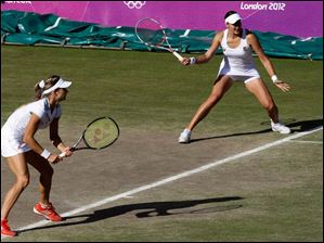 Maria Kirilenko, left, and Nadia Petrova, right, of Russia, play Liezel Huber and Lisa Raymond of the United States in the women's doubles bronze medal match at the All England Lawn Tennis Club at Wimbledon, in London. Petrova and Kirilenko won the medal match.