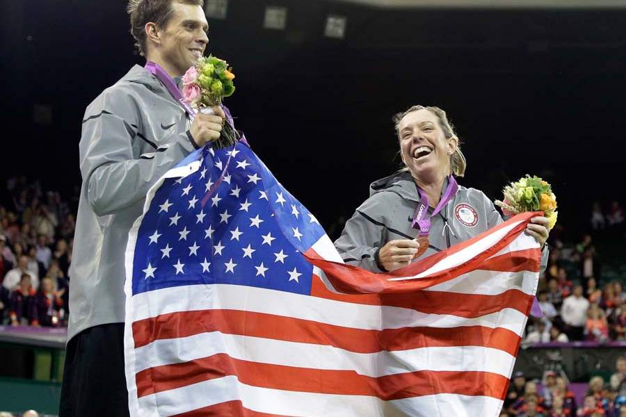 Mike Bryan and Lisa Raymond of the United States celebrate their bronze medals in mixed doubles at the All England Lawn Tennis Club in Wimbledon.