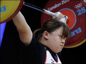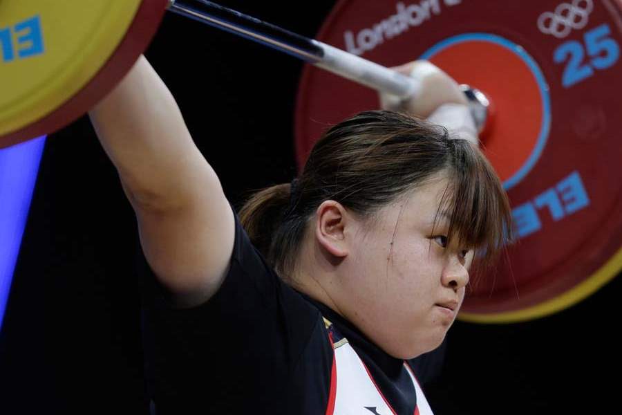 Japan's Mami Shimamoto competes during the women's over 75-kg weightlifting competition.