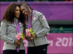 Serena Williams, left, and Venus Williams of the United States smile together on the podium after receiving their gold medals in women's doubles.