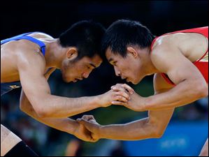 Russia's Mingiyan Semenov, right, competes against South Korea's Choi Gyu-jin during a 55-kg bronze medal match in Greco-Roman wrestling competition.