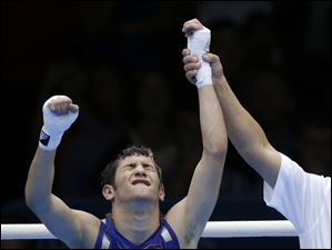 Uzbekistan's Jasurbek Latipov, left, fights Egypt's Hesham Abdelaal during a men's flyweight 52-kg preliminary boxing match.