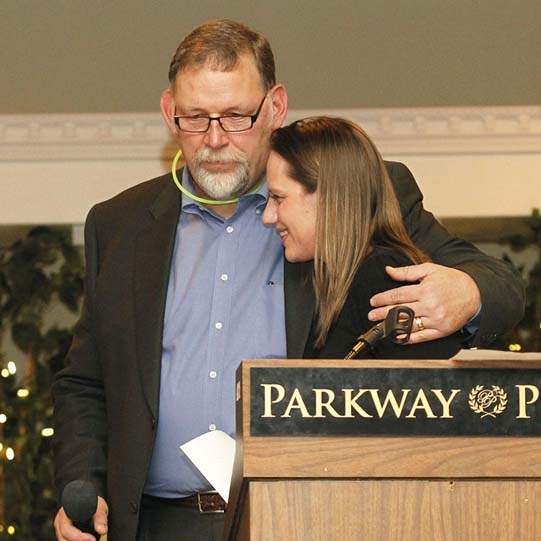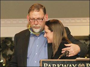 Chairman Dr. David Mallory hugs Anna Wilson, sister of the late Shannon Wilson, after her speech during the LEAP fundraiser event at Parkway Place in Maumee, Ohio.