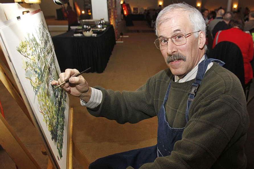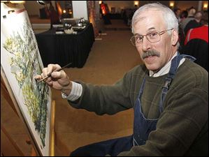 For the Love of Art owner Bob Schira works on this painting that will framed and auctioned off for the LEAP fundraiser at Parkway Place in Maumee, Ohio.