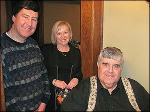 Purr-fect Evening: Ken Thomas and Jen Arbaugh with Paws and Whiskers manager Dave Plunkett, sporting his cat motif print suspenders (straps).