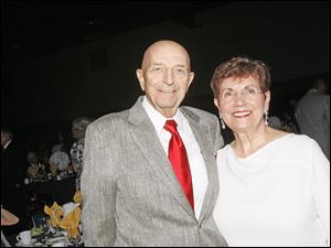 Tony Clark, past chairman of the Jamie Farr Golf Tournament, poses with his wife Mary for a picture during the Hollywood Casino Gala Dinner & Show at the SeaGate Centre in Toledo, Ohio.