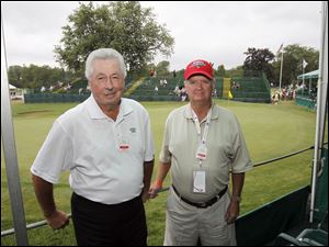 Roy Carter, left, and Harry Womack, right, in the skybox during the Jamie Farr at Highland Meadows Golf Club in Sylvania on August 9, 2012.