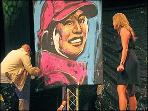 David Garibaldi thanks the crowd after painting a portrait of John Lennon upside down during the Hollywood Casino Gala Dinner & Show at the SeaGate Centre in Toledo, Ohio, on Tuesday.