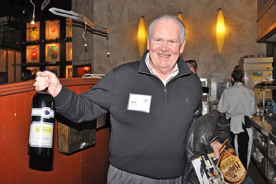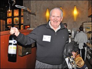 Don Harbaugh shows the bottle of wine he purchased during the St. Francis de Sales Knight of the Vine benefit.
