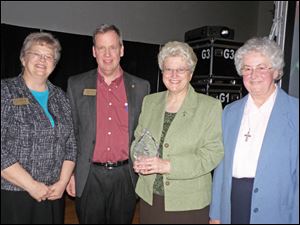 William Balzar, left center, stands with, from left, Sister Mary Ann Culpert, Sister Mary Delores Gatliff , and Sister Mary Carol Gregory, of Notre Dame Academy, as they accepted the Diamond Eagle Award.