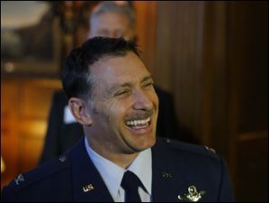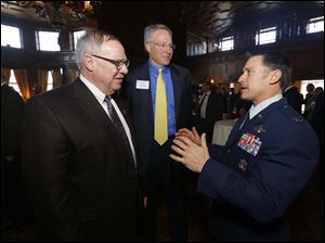 Mayor D. Michael Collins, left, and Richard Hylant speak with Colonel Craig R. Baker, new Commander of the 180th Fighter Wing, during a reception for him at the Toledo Club.