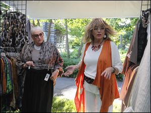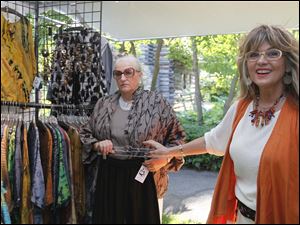 Rosalee Heyman, of Maumee, left, tries on clothes created by Marijke Benedict, of Allenwood, Pa., at the Preview Gala for the 49th Annual Crosby Festival of the Arts in Toledo.