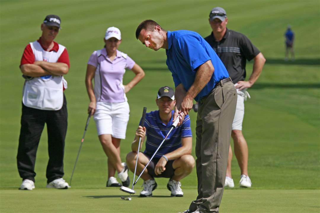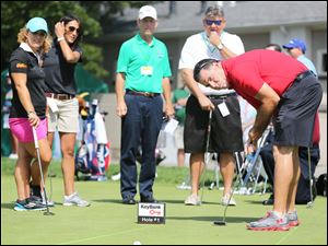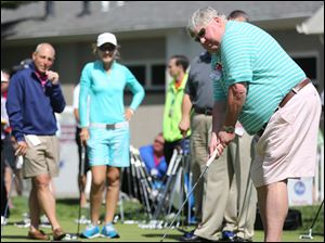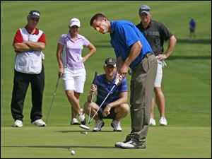 Michael Nichter putts during the 2014 13abc/PNC Pro-AM at Highland Meadows Golf Club in Sylvania. Watching is pro Kayla Mortellaro.