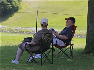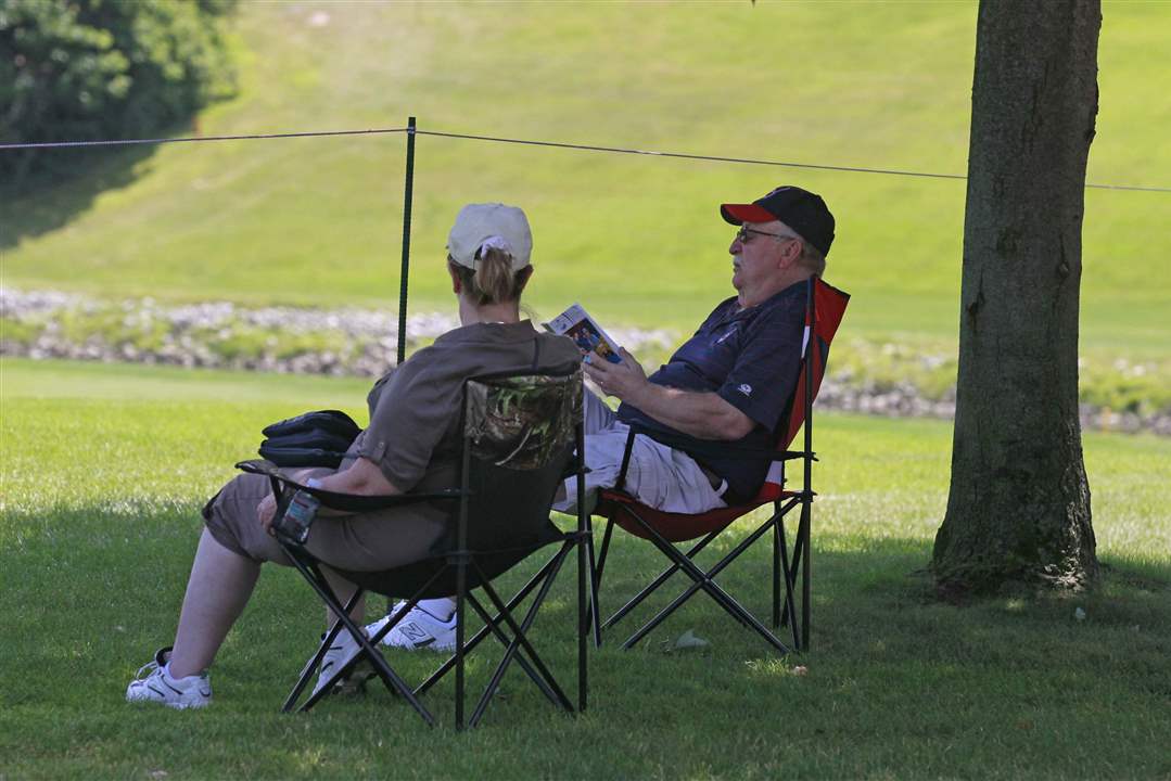 Debra and Jim Thomas, of Toledo, sit under the shade as they watch golfers on Hole 18 during lunch for the 2014 13abc/PNC Pro-AM at Highland Meadows Golf Club in Sylvania.